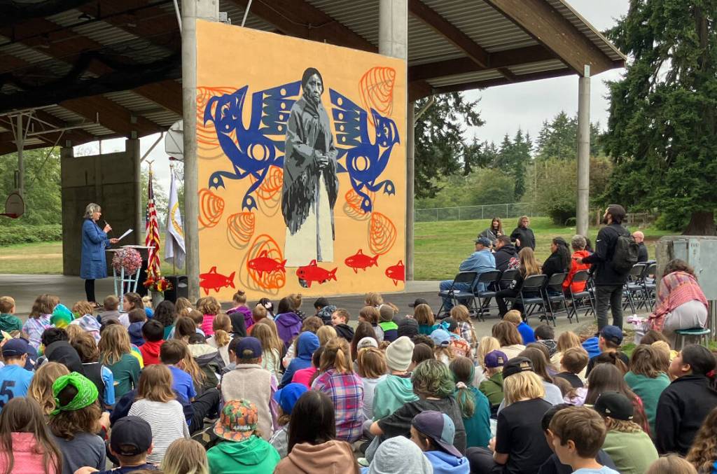 On Monday, a vibrant new mural at Chautauqua Elementary School was unveiled, honoring the legacy of Lucy Slagham Gerand and her important role in preserving the history and culture of the s ̌xwəbabs, or Swiftwater People, who resided on Vashon for millennia.