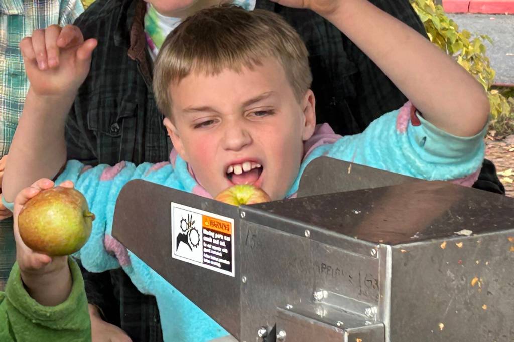 An apple pressing station brought joy to young and old at Cider Fest. (Tom Hughes photo)