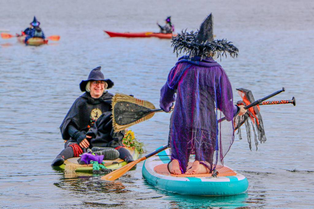 Paddlers decked in their best witch attire bring an annual Halloween tradition to life at Jensen Point, turning the waterway into a scene of spooky, floating fun. (Aspen Anderson photo)