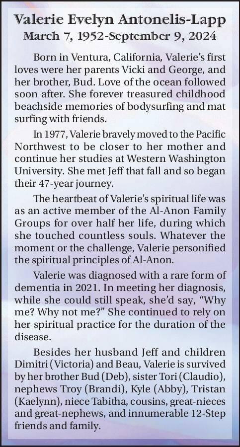 The heartbeat of Valerie’s spiritual life was as an active member of the Al-Anon Family Groups for over half her life, during which she touched countless souls. Whatever the moment or the challenge, Valerie personified the spiritual principles of Al-Anon.