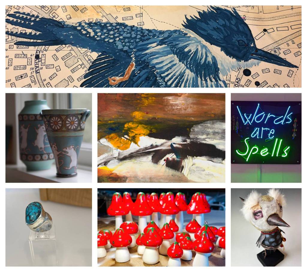 Jennifer Hawke Studios — works by Jennifer Hawke, Rachel LordKenaga, Mary McGinnis and Monica Gripman include holiday wreaths, watercolors, tarot cards, assemblages, miniatures, sculptures, ceramics and oil paintings, at 18531 Beall Rd. SW.