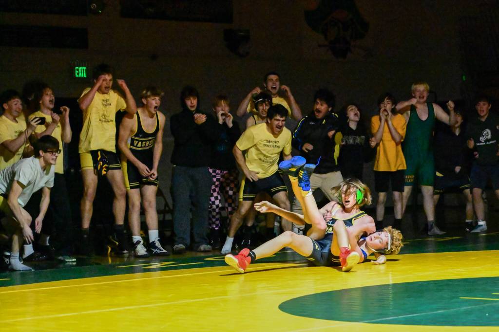 Vashon wrestlers celebrate Caleb Connor’s fall victory over a Life Christian wrestler. (Tony Puz photo)