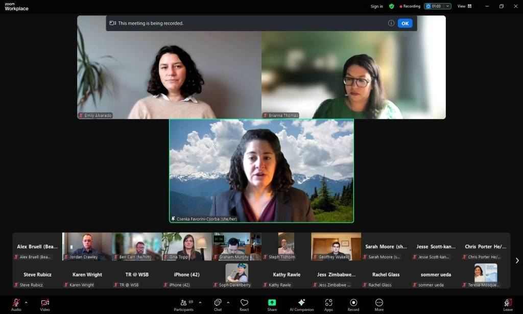 In this screenshot from Sunday’s candidate forum, attendees listen to pitches from Csenka Favorini-Csorba, Emily Alvarado and Brianna Thomas for 34th Legislative District seats.