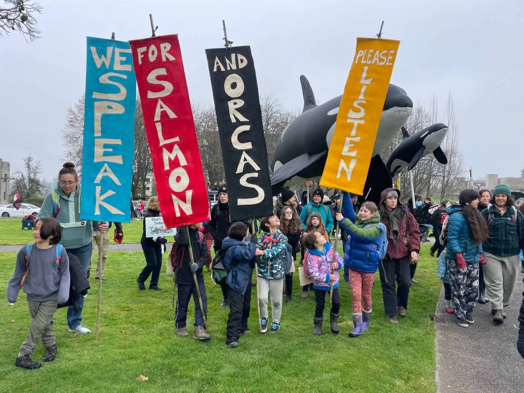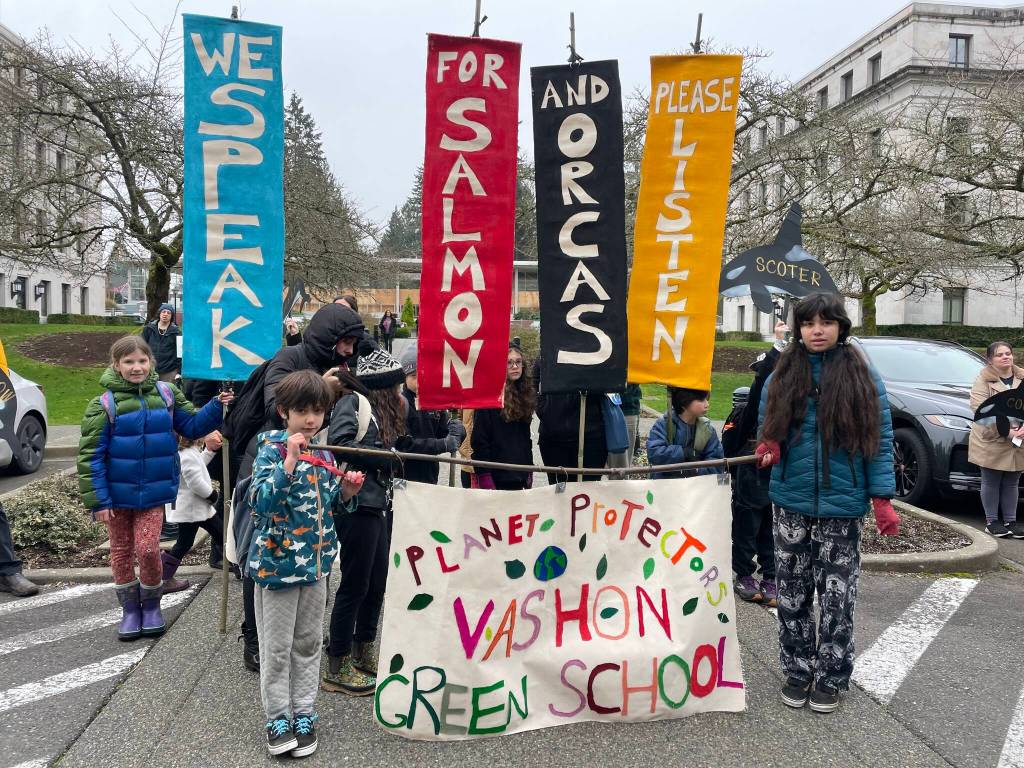 A group of Vashon residents traveled to Olympia on Wednesday, Jan. 15 for the opening week of the 2025 state Legislative session to demand action around breaching the lower Snake River dams. Vashon Green School students and Backbone Campaign provided colorful banners and orca and salmon props as inspiration in these photos shared by Vashon Green School founder and director Dana Schuerholz.