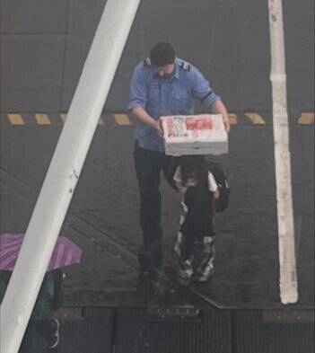 Washington State Ferries last week shared this photo of Sailor Evan Tarbell, who while picking up a pizza for his crew at Vashon’s north end ferry terminal, used the pizza box as a makeshift umbrella for a student boarding the ferry during a sudden downpour. “In that moment, he showed care, creativity and a clear sense of responsibility – not just to his team, but to the community we serve,” WSDOT Deputy Secretary for WSF Steve Nevey said in a statement. (WSF Captain Clinton Jones photo)