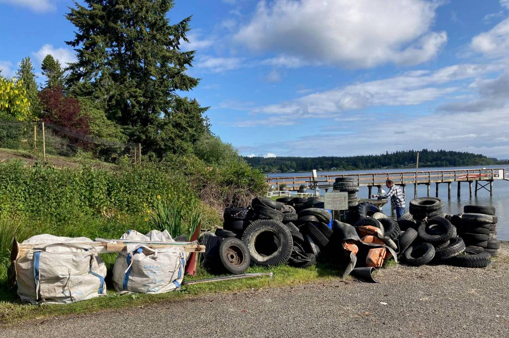 Thanks are due to the more than 50 islander and visitor volunteers who pitched in to comb island beaches, removing plastic and other unnatural flotsam and jetsam — including the McLean Road neighborhood team which excavated more than a dozen tires at low tide on Saturday. Thanks also to George Spano, Erin Kieper and Keller Cyra for providing their boats for three expeditions lasting more than 15 hours altogether over the last month to recover and transport all the tires from remote beaches to Jensen Point Park, where they were staged.