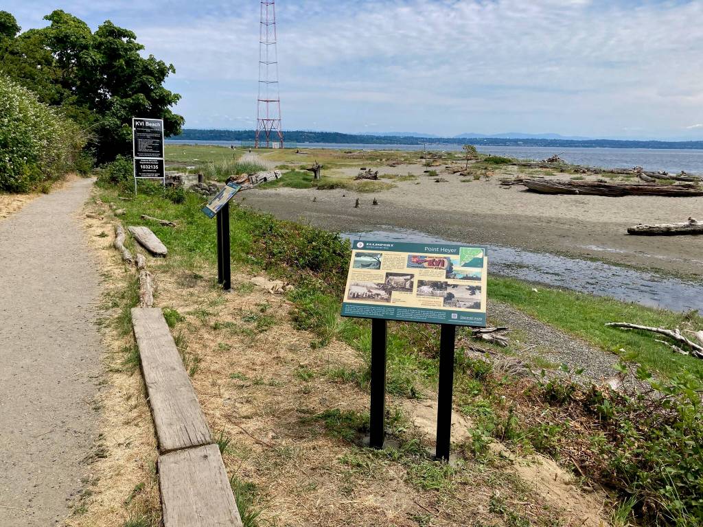 The one-mile trail begins at the Tramp Harbor waterfront parking area near Ellisport Creek, and winds through the neighborhood and the entrance to KVI beach. It reflects Ellisport’s community spirit, rich history and natural ecosystem’s protections with informative signs depicting pictorial views and stories of the past — allowing one to imagine the past while reinforcing the importance of our relationship with this place and with the environment in general.