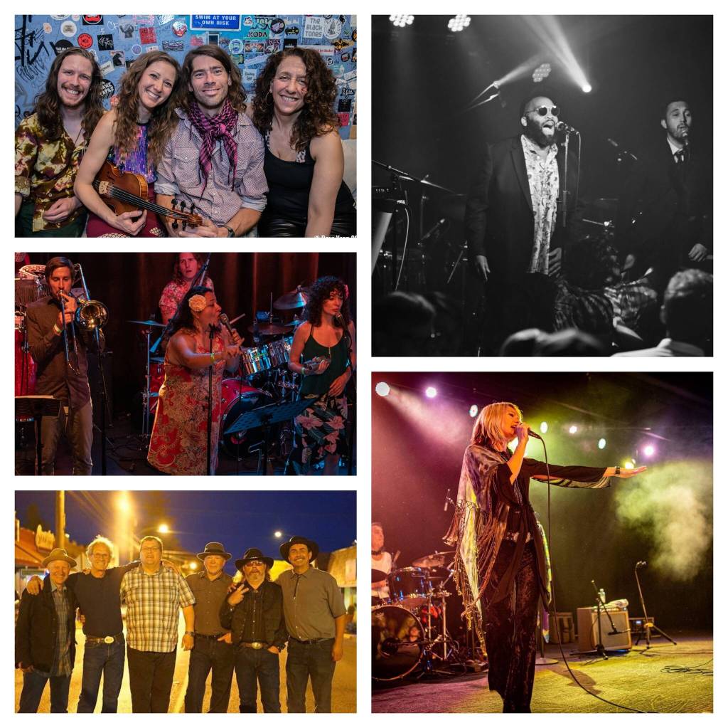 Bands in this year’s Concerts in the Park series, in order of their appearances, include (right, top to bottom) Object Heavy, Wild Rumours, (left, top to bottom) The Sweet Lillies, The Cumbieros, and The Great Divide. (Courtesy photos)