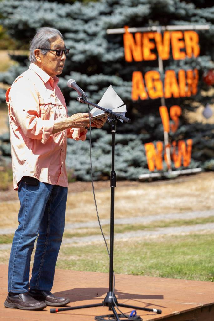 “The Japanese phrase ‘okagesama de’ succinctly conveys what this celebration today is about,” Okimoto said. “Translated, it means ‘I am me because of you.’ … My story is an example of okagesama de. … Once my freedom and rights as an American citizen were restored, I could freely compete and ascend the educational ladder, but I could not have done this alone.”