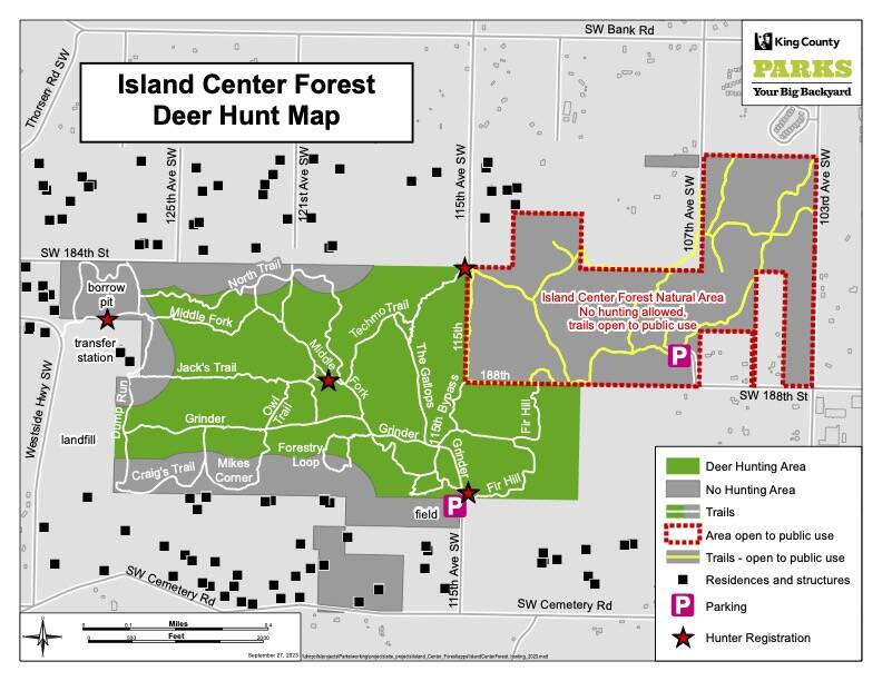 The annual limited deer-hunting season at King County Parks’ Island Center Forest is set for Oct. 11-31. During that time, trails in the Natural Area of the forest will be open for public use, but the rest of the park will be closed to all other users except for hunters.