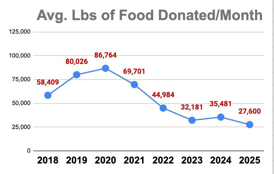 But the food bank is receiving fewer donations from partner programs. In 2018, it received about 58,400 pounds of donated food per month. In 2025, that figure has dropped to about 27,600 pounds.