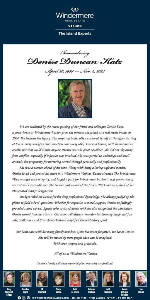 “She was a woman ahead of her time,” her colleagues and friends have written in a tribute. “Along with being a loving wife and mother, Denise loved and poured her heart into Windermere Vashon.”