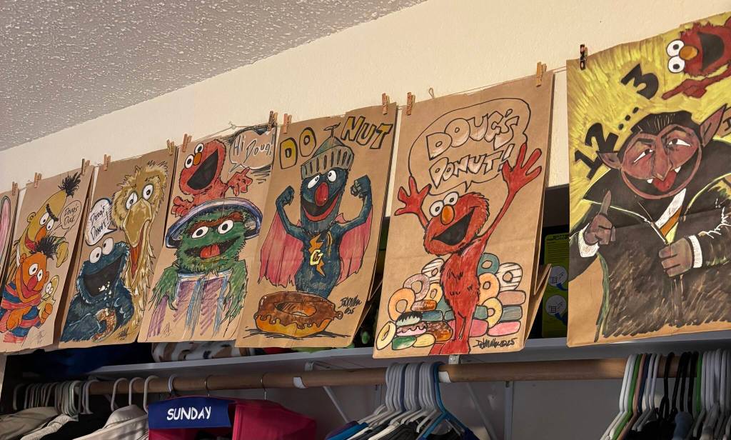 The embellished brown paper bags, now displayed in Hershey’s home, are covered in detailed illustrations of cartoon characters. They brightly declare who and what the bag is for: “Doug’s Donut!” Depictions of Elmo frequently appear on the bags, as do many other of Hershey’s favorite Sesame Street characters.