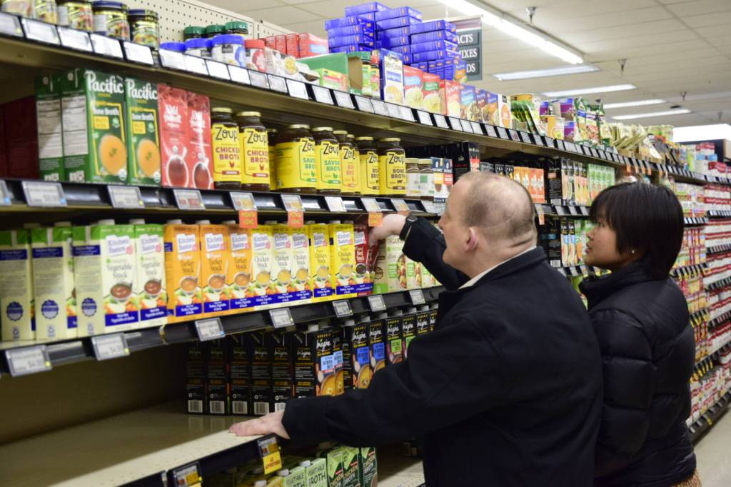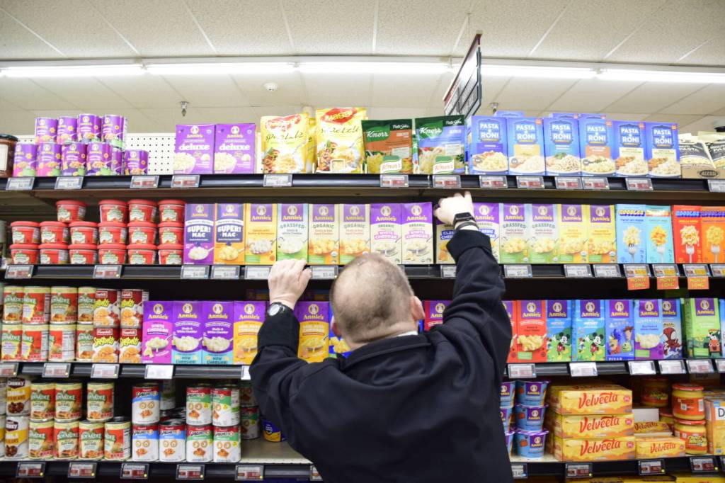 His job coach, Ploy Chaleoy, watches closely from a few feet away. She is there to point out if a detergent bottle or cereal box goes unadjusted, but mostly allows him to do his work. Chaleoy has been coaching Hershey for the last year and a half.
