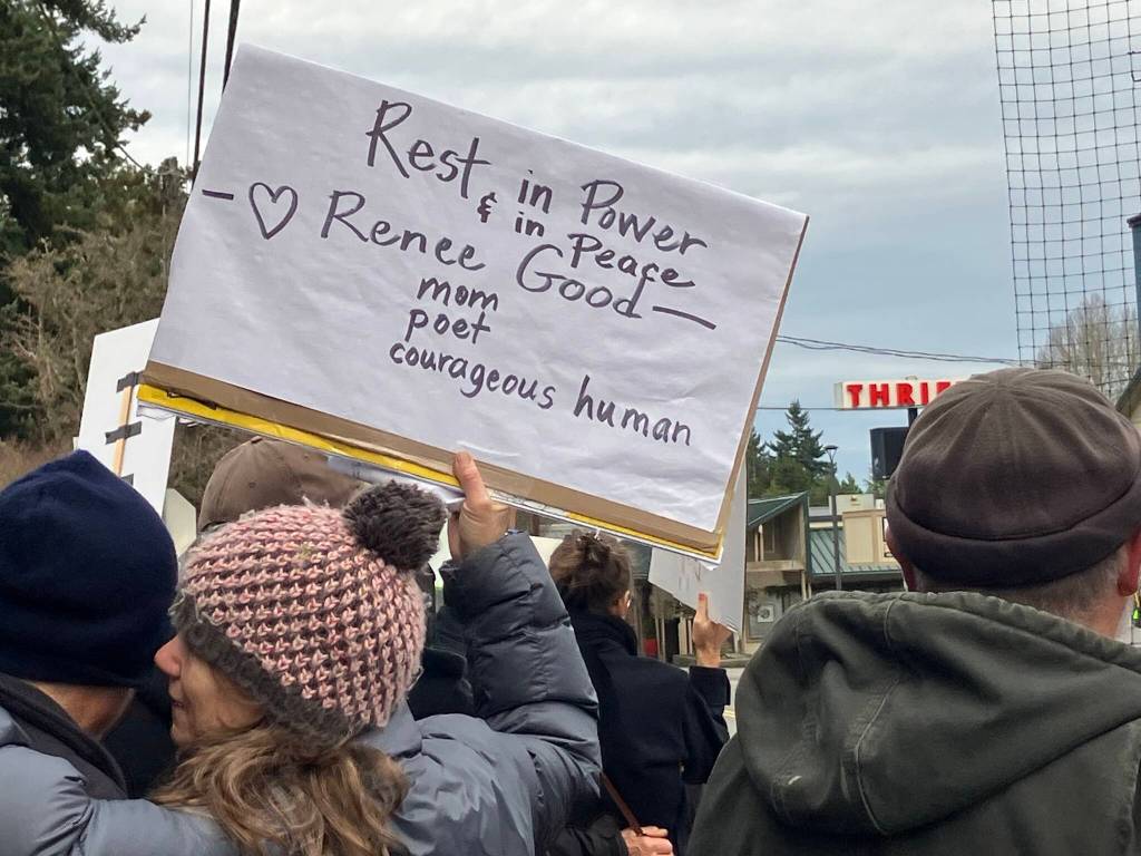 At 2 p.m., the protesters, accompanied by several drummers beating out a solemn rhythm, processed the short distance to line the center of town. There, the group heard from speakers who included Ann Spiers, Vashon’s inaugural poet laureate.