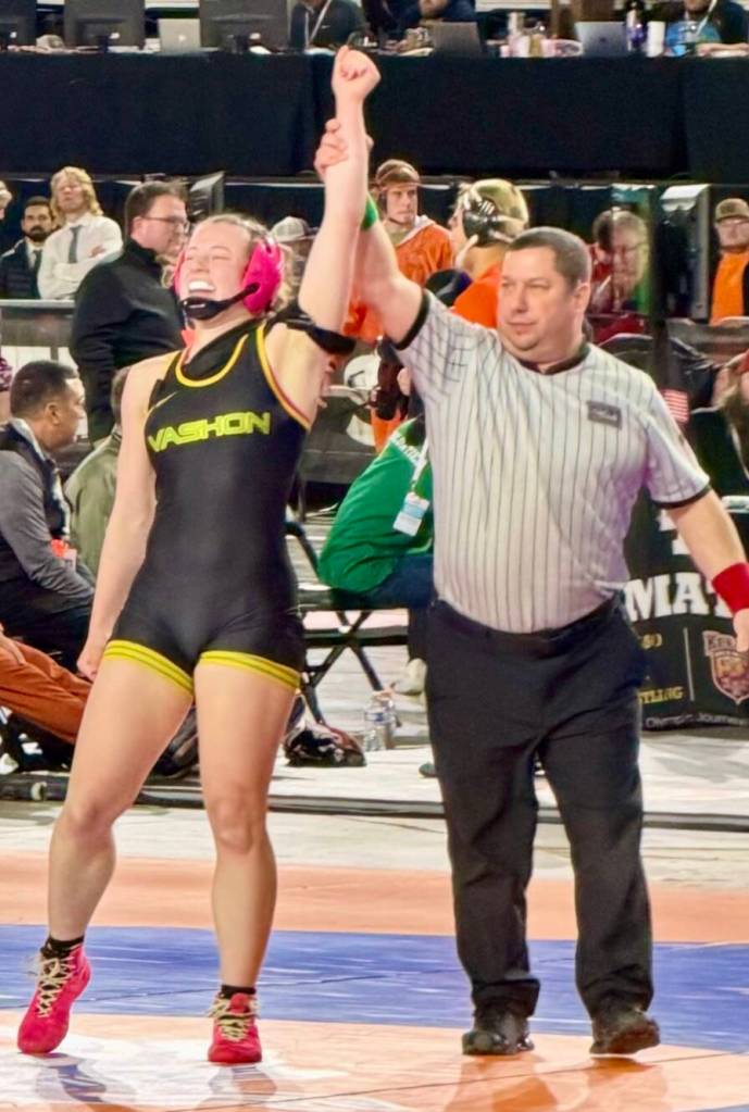 Vashon wrestling coach Anders Blomgren said there was a “Lena celebration party” in the center of the Tacoma Dome after her win — large enough that arena security even blocked him from joining it.
