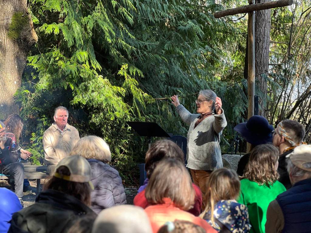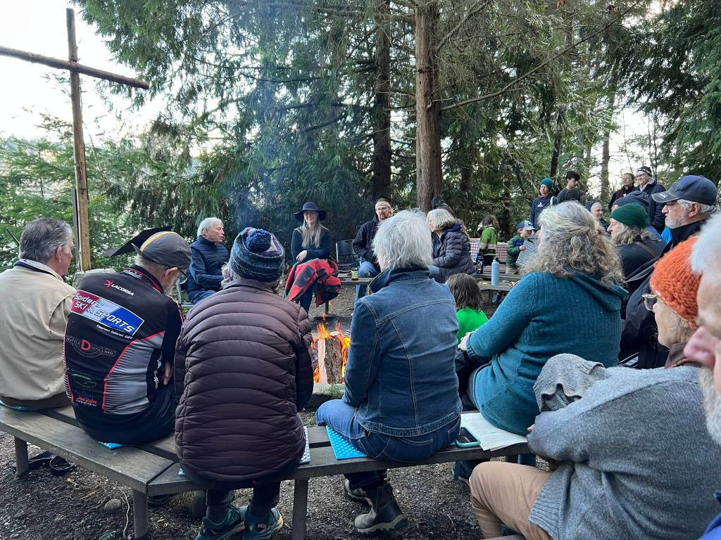 As the clouds parted and a fire crackled to life, roughly 70 people gathered on a recent Saturday afternoon at Camp Burton overlooking Quartermaster Harbor to celebrate World Storytelling Day.