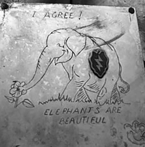 He then pulled back the cover on the full-size elephant skull. His unit’s crest was affixed to the smiling elephant drawing the Aussies had dropped on the Americans, along with the words, “I agree! Elephants are beautiful.”