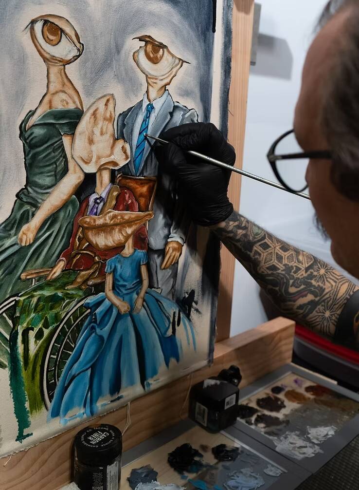 The studio has attracted a crowd of locals, but many of Kaltreider clients come from his nomadic days as a van-lifer, who travel from across the country to get tattooed by him — drawn to his psychedelic, surrealist style defined by mushroom-headed characters, geometric patterns and trippy botanicals.