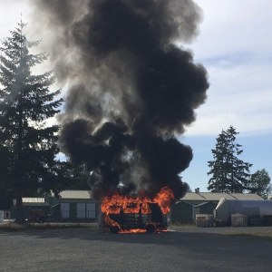 Thick black smoke billowed up from the parking lot of Seattle Distilling on Saturday evening as a Volkswagen…