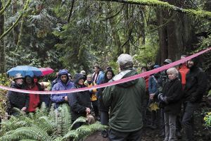 A crowd of about 20 people gathered in the forest near Fern Cove on Sunday for a ribbon…
