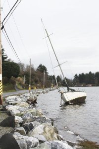 Quartermaster Drive was closed for several hours on Monday afternoon as a sailboat that washed ashore in Quartermaster…