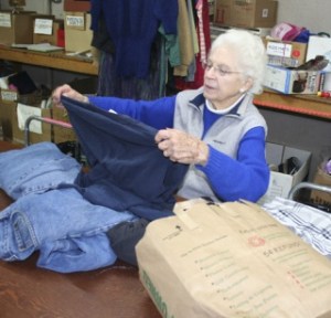 Grace Crecelius sorts through a paper bag full of clothing at Granny’s Attic