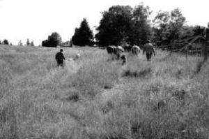 Two farmhands and Island cows in a pasture on a Vashon farm.