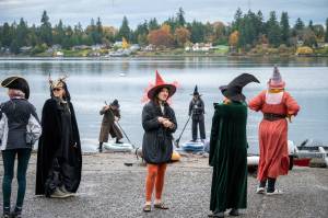 Witches in pointed hats and capes take to the cold waters of Jensen Point during the fifth annual Witches Paddle on Saturday. (Kent Phelan Photo)