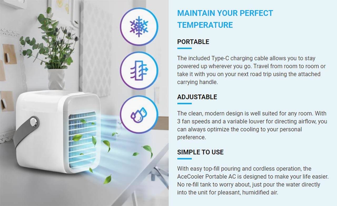 Acecooler is a portable device that allows you to stay cool and comfortable wherever you are. It can be used anywhere around the house, and it is also safe to keep it beside you when you sleep. It does not cause any side effects. What it will do is it will help purify the air around you so that you can breathe in fresh and cool air.