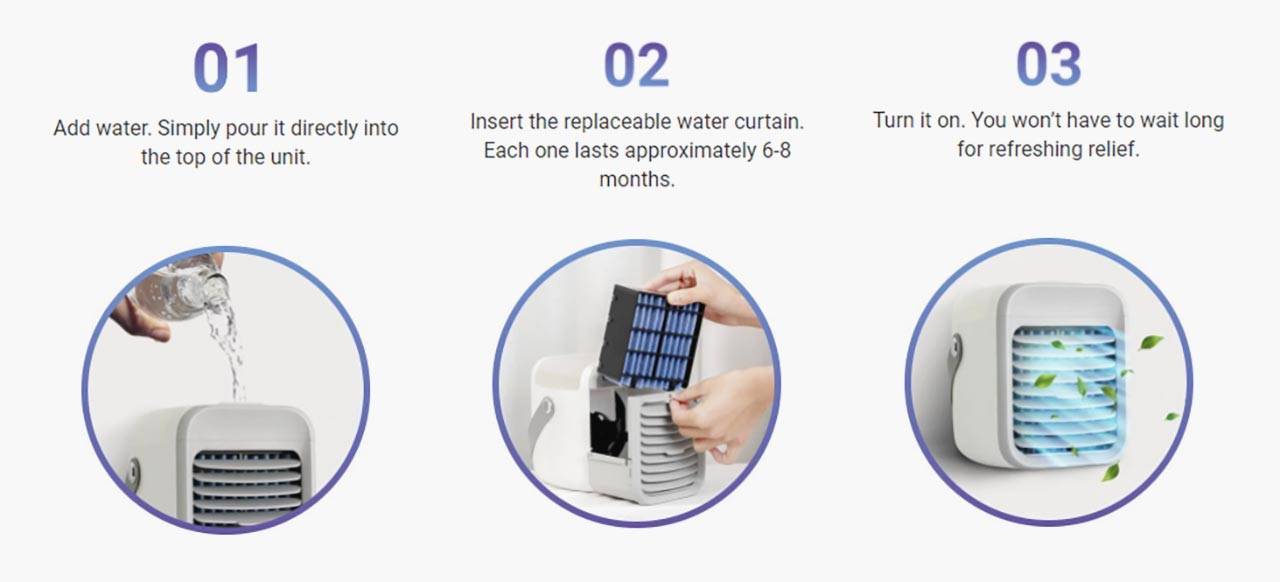 According to the official website, Acecooler works systematically so long as you use it correctly. It works on the principle of evaporation. The cooler the water, the cooler the air gets. To use it, pour water into the top of the device, then insert a water curtain, which will last from around 6 to 8 months. Finally, turn the device on and enjoy.