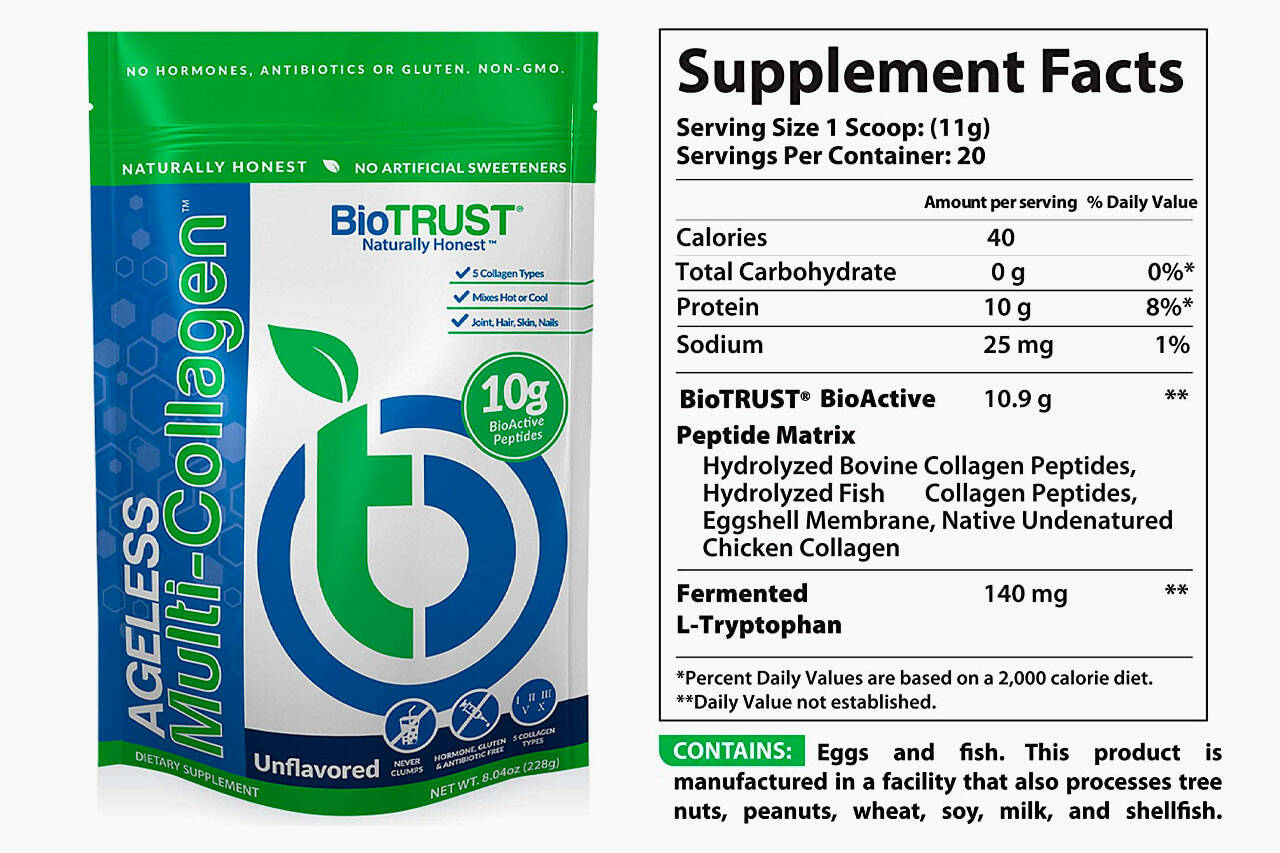BioTrust Ageless Multi-Collagen is a formula that contains active ingredients that offer maximum benefits to the body. Each ingredient contained in the supplement is tested to ensure quality and potency. It does not have any adverse side effects making it safe for use.