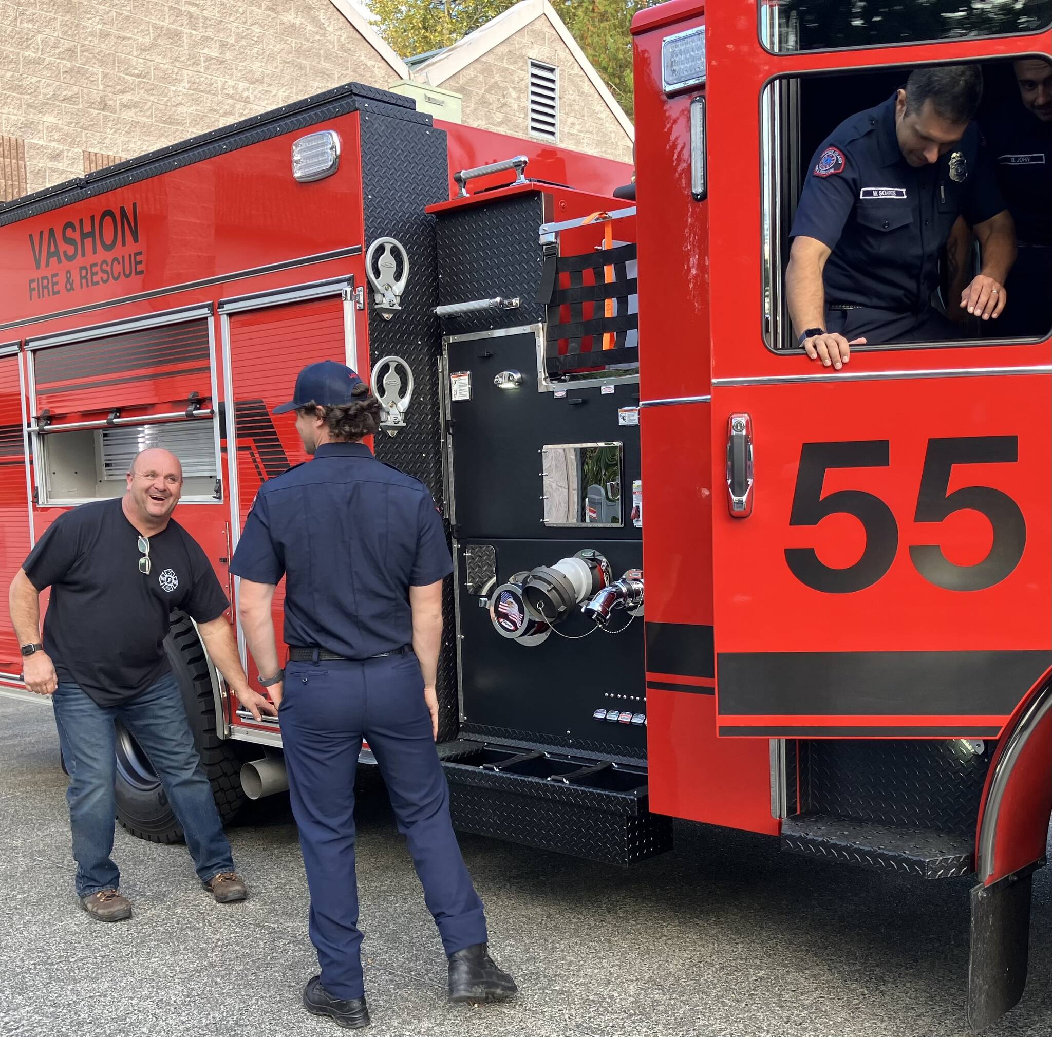 At the station, Vashon’s firefighters and EMTs were waiting in formation to greet the rig — and once it was parked, eagerly swarmed around, atop, and inside it, checking out all its features.