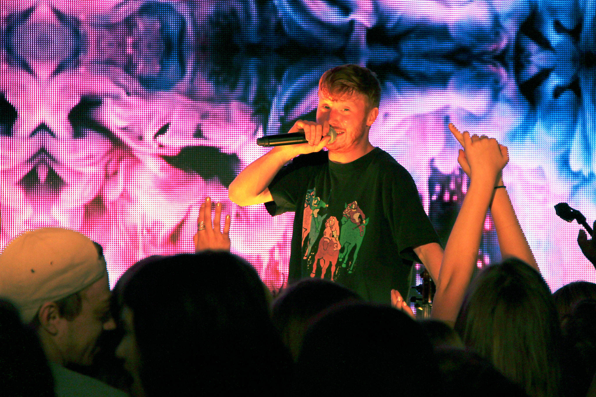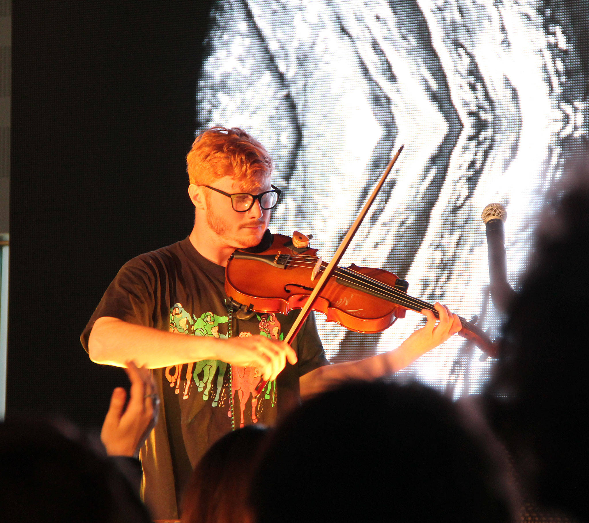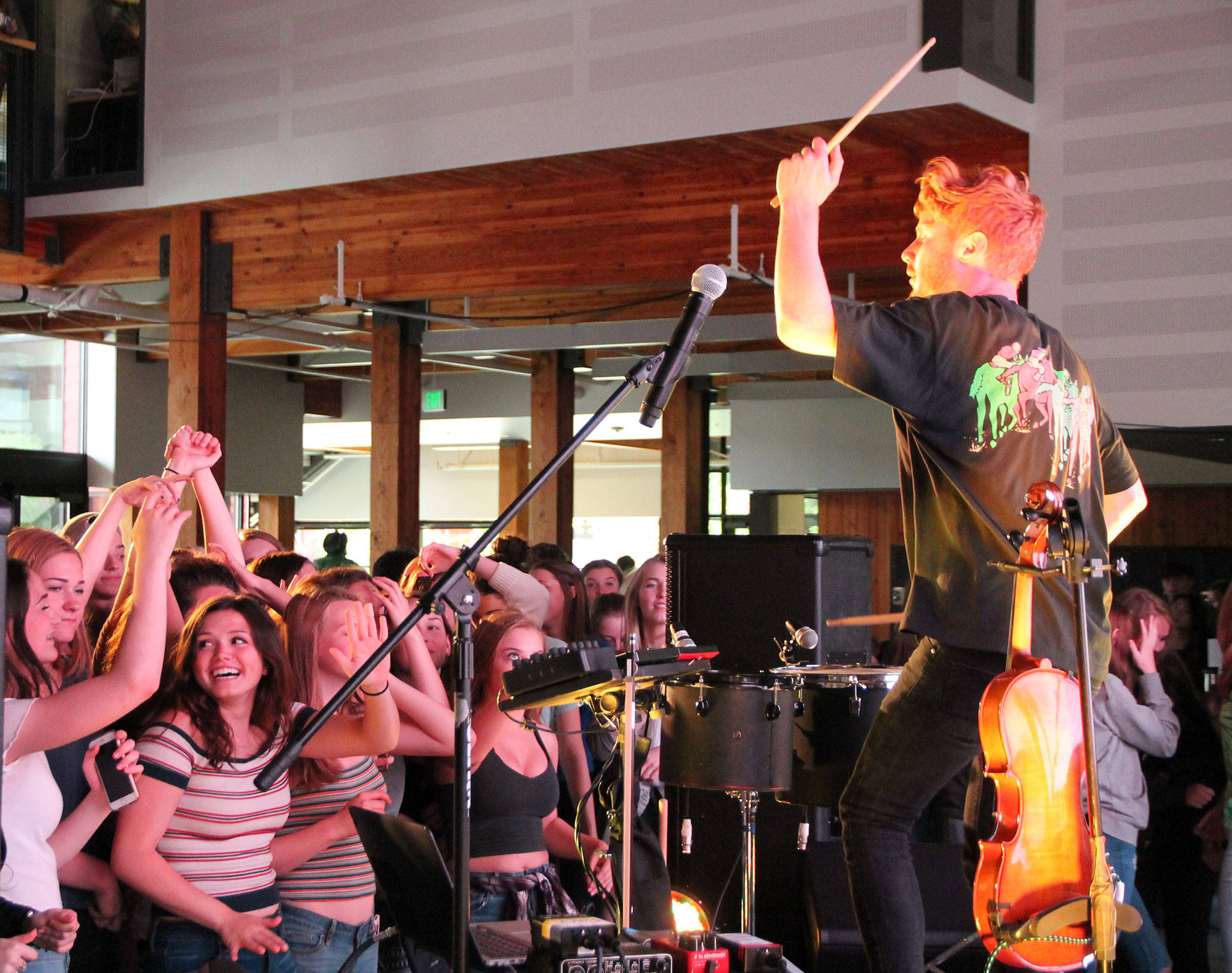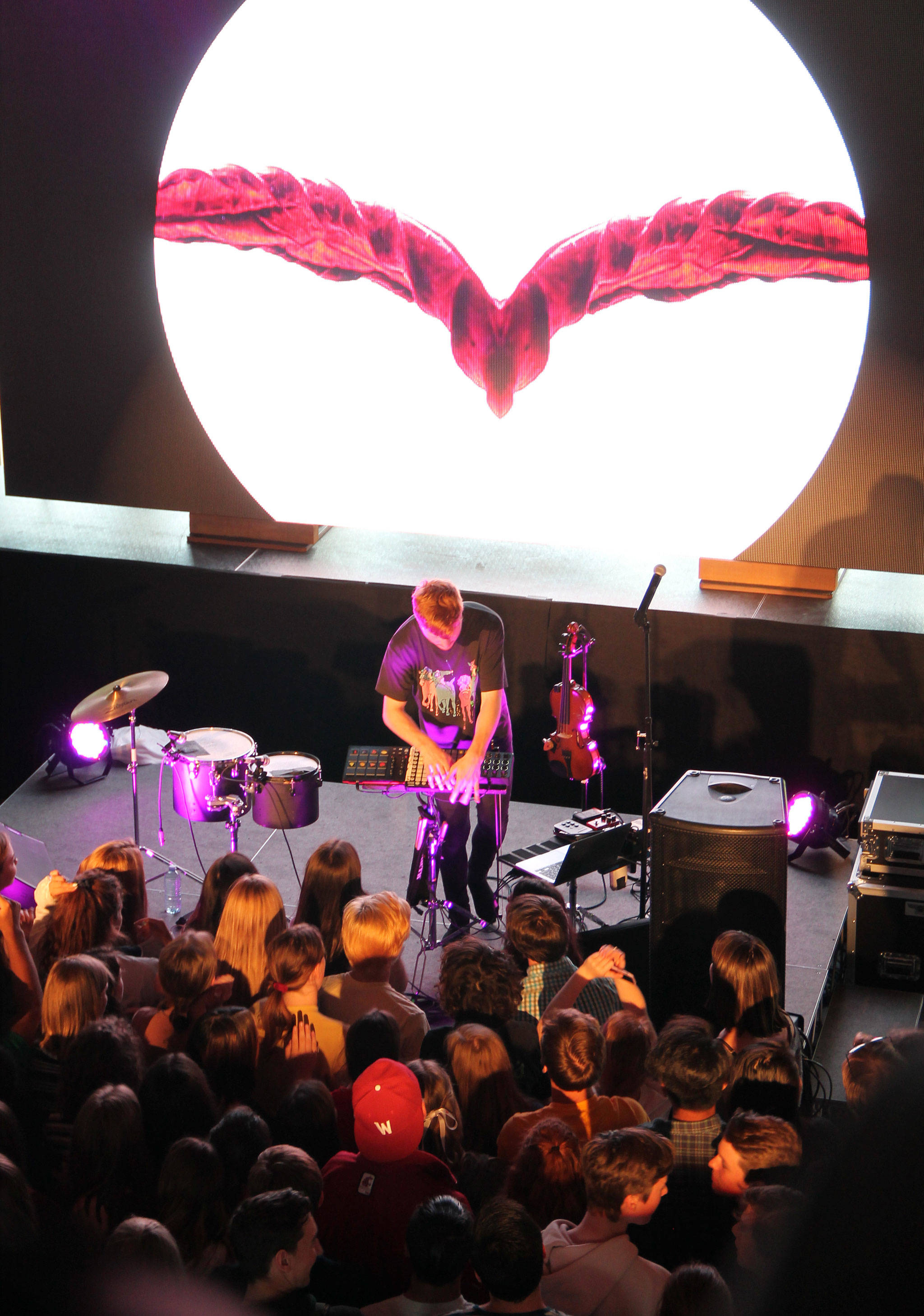 Students crammed onto the balconies surrounding the school’s grand hall while others pushed close to the stage and the light wall that displayed colorful images throughout the hour-long set. The musician also stayed after to sign autographs and take photos with students. A baseball cap and a bass guitar were among the items the musician – whose real name is Grant — signed.