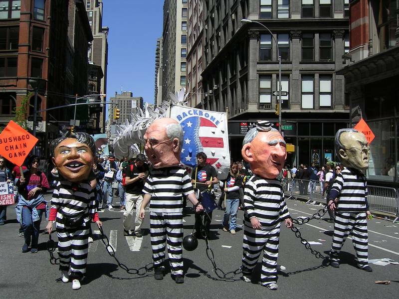 In the early 2000s, Jarcho sculpted the “chain gang,” a lineup of caricatured political figures — George W. Bush, Dick Cheney, Donald Rumsfeld and Condoleezza Rice — dressed in black-and-white prison uniforms and linked together by chains. The pieces were absurd, grotesque and funny and they became part of anti-war demonstrations through the Bush years.
