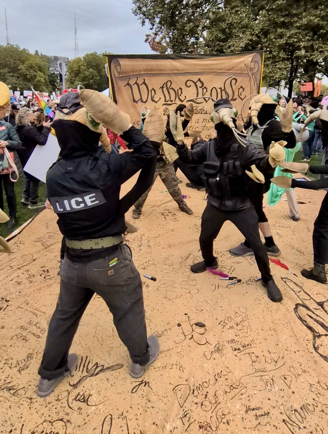One of Moody’s longest-standing creations is the “We the People” scroll — an 18-foot-wide muslin-and-starch banner, hand-painted to mirror the preamble of the Constitution and capable of extending up to 200 feet. Created in 2007, the scroll became the kind of protest imagery that defined Backbone’s work.