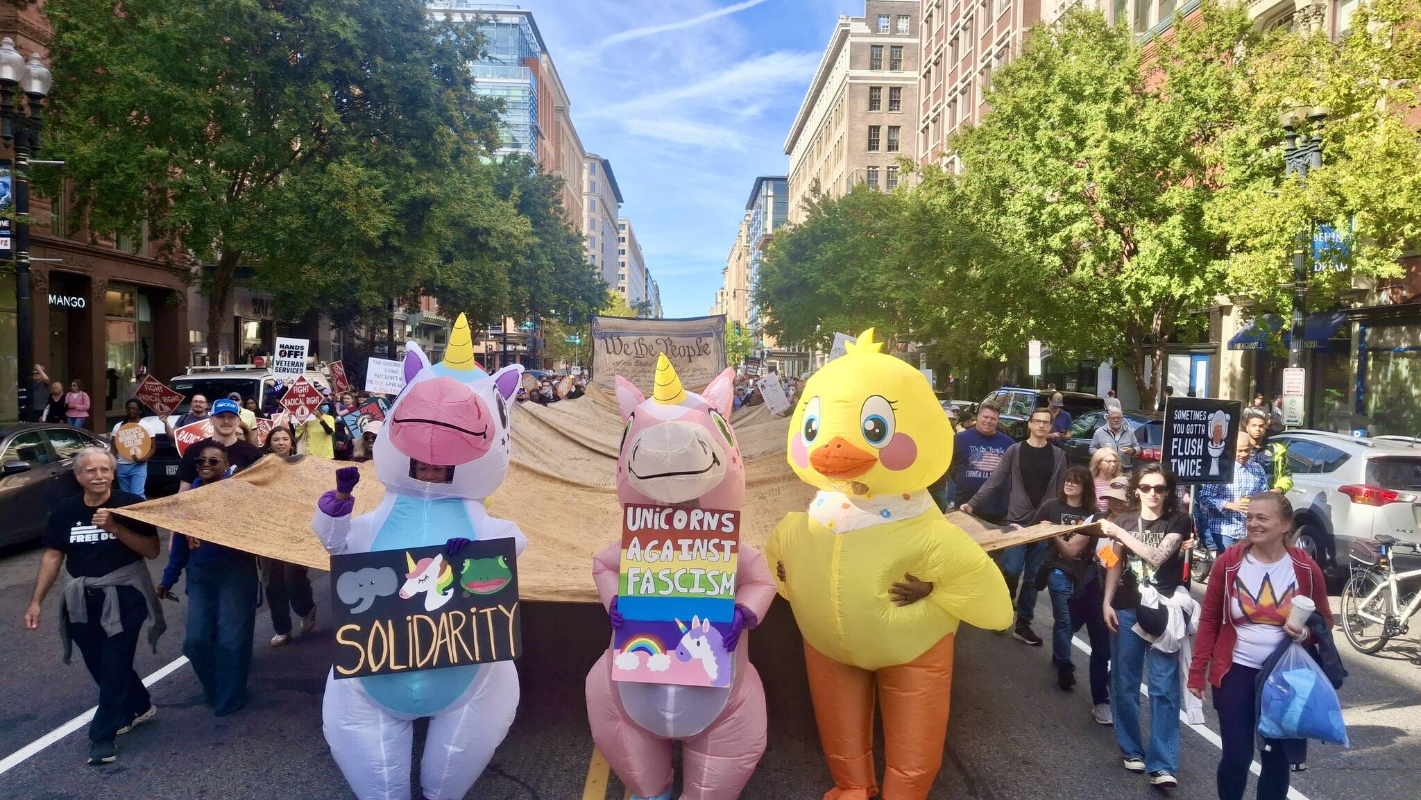This summer, Moody made two more. So during October’s “No Kings Day” protests, three of the scrolls were seen in the streets at once — one in Washington, D.C., one in Chicago and one near Backbone’s home in Seattle.
