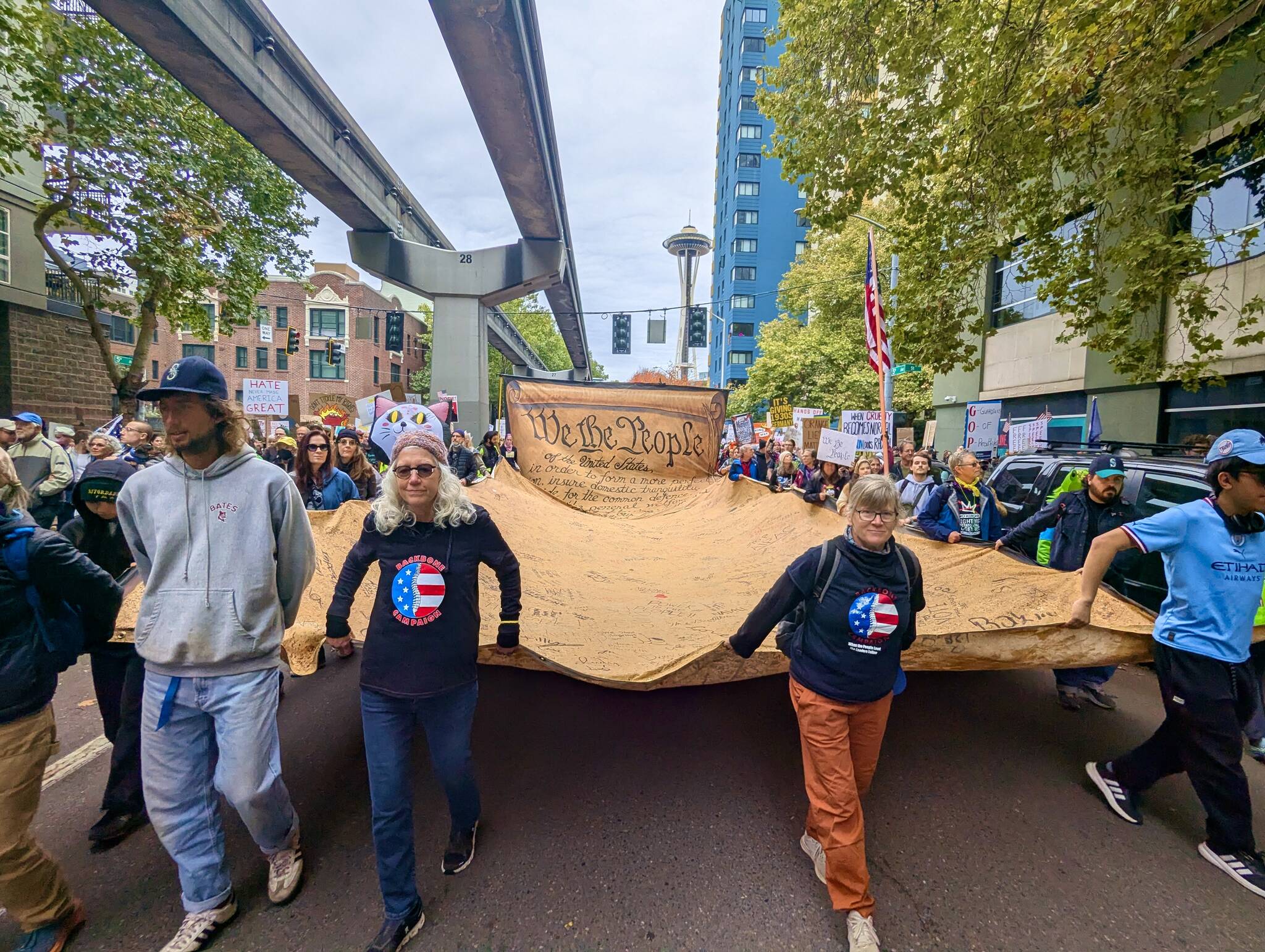 On Oct. 18, three identical banners — each 18 feet wide and painted with the words “We the People” — unfurled in three different cities at once. In Washington, D.C., Chicago and Seattle, marchers — both Vashonites and strangers — held the edges, carrying the scroll through the cities.